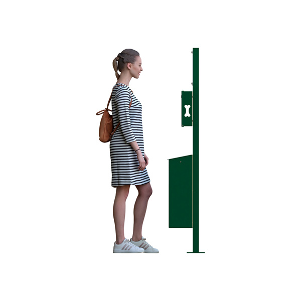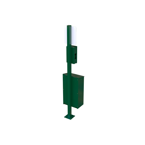 Complemento para circuito canino: bote de basura de metal con señalética y compartimiento para tomar bolsas de basura.
