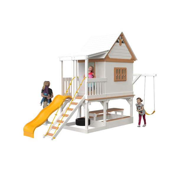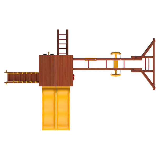 Juego de madera mediano con un columpio, un caballito, dos resbaladillas, un muro de rappel, una rampa, una mesa picnic, un volante y unos binoculares. Estructura de madera de pino amarillo estufada y tratada para exteriores, resane y recubrimiento en pintura red wood.