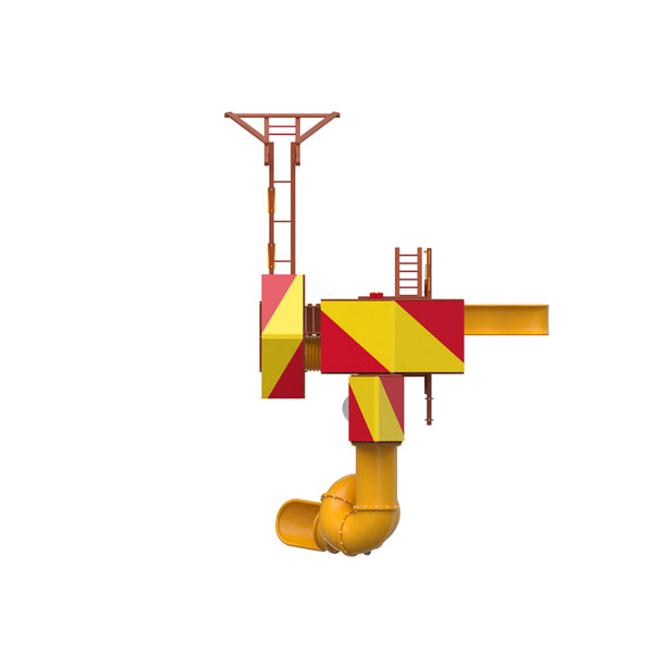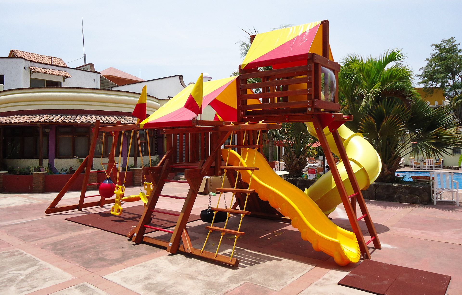 Juego de madera con tobogán, una resbaladilla, 2 columpios, un trepador, un columpio de llanta, una rampa trepador, un pasamanos, una burbuja de acrílico, unos binoculares y un volante. Estructura de madera de pino amarillo estufada y tratada para exteriores, resane y recubrimiento en pintura red wood.