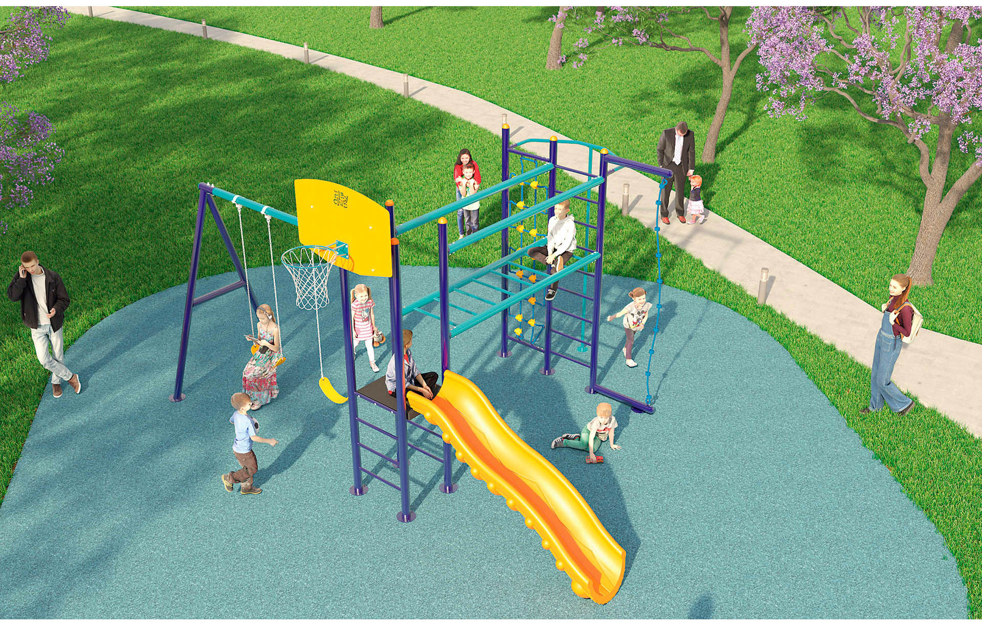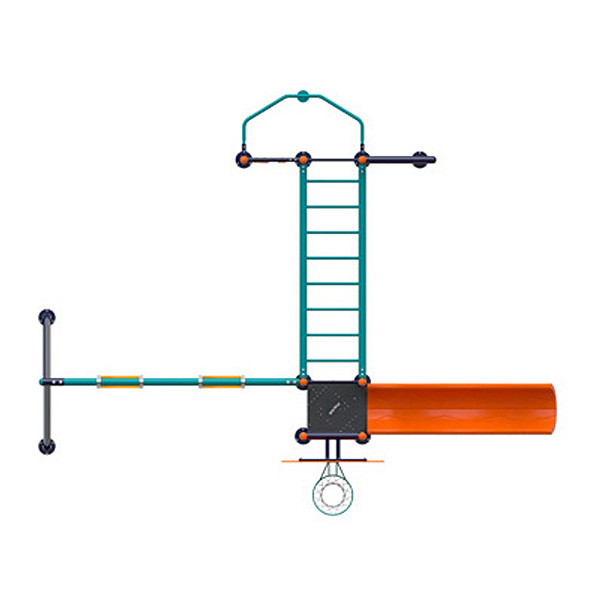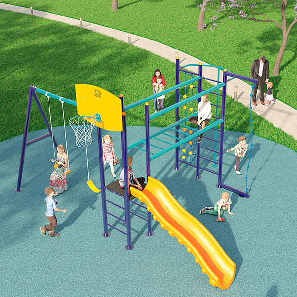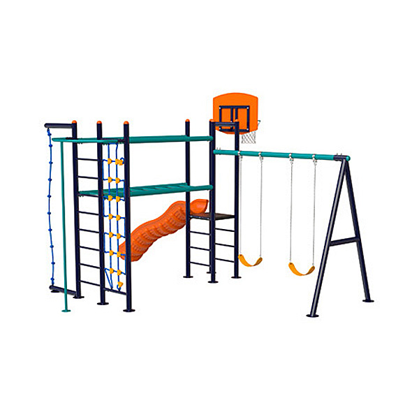 Juego infantil básico con 1 resbaladilla recta, 1 canasta de baloncesto, 2 columpios, 1 puente con barandal, 1 tubo deslizante de bomberos* y trepadores de cuerda.
