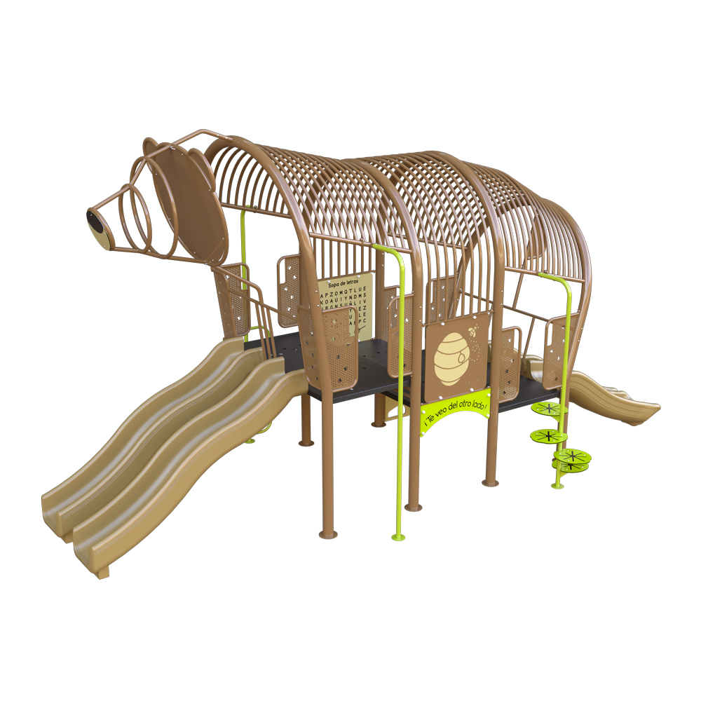 Juego infantil temático que contiene; 2 resbaladillas rectas, 2 rapeles con cuerda inclinados, 2 escaleras rectas, 2 volantes, 2 asientos, 1 panel burbuja. Acabado en pintura electrostática, libre de metales pesados, que garantiza una mayor durabilidad del producto. Componentes de plástico de alta densidad con protección UV.