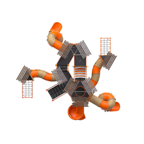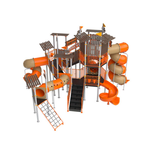 Juego infantil temático que contiene; 2 toboganes en espiral, 1 resbaladilla espiral, 2 rapeles con cuerda inclinados, 1 trepador de cuerdas vertical, 2 túneles curvos grandes, 1 escaleras de fácil acceso, 4 paneles bongos. Acabado en pintura electrostática, libre de metales pesados, que garantiza una mayor durabilidad del producto. Componentes de plástico de alta densidad con protección UV.
