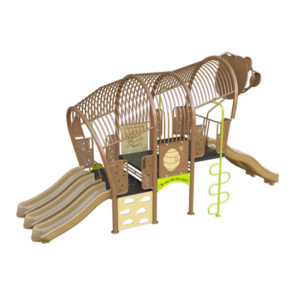 Juego temático de oso; incluye 5 resbaladillas rectas, 1 trepador lilypads ascendente, 1 rapel de polietileno ascendente, 1 trepador en espiral, 1 tubo de bomberos, 1 tunel y 2 paneles didácticos. Acabado en pintura electrostática, libre de metales pesados, que garantiza una mayor durabilidad del producto. Componentes de plástico de alta densidad con protección UV.